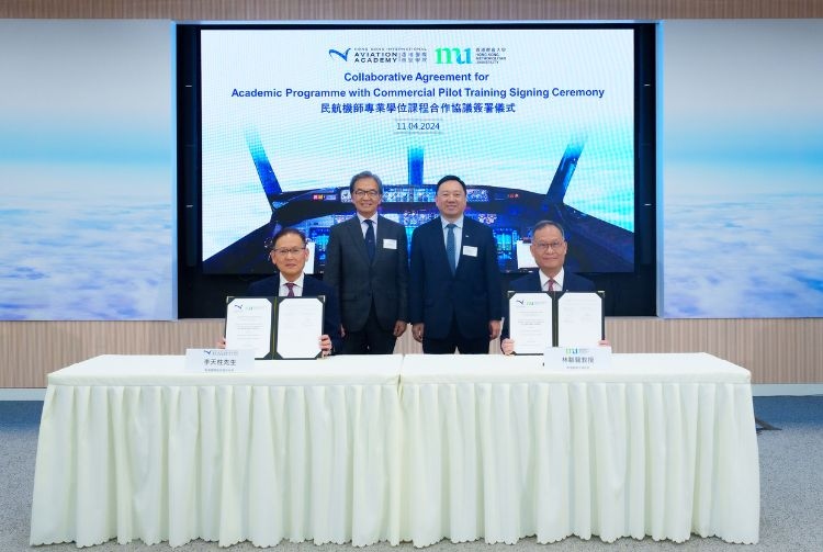 The Hong Kong International Aviation Academy (HKIAA) and Hong Kong Metropolitan University (HKMU) today signed a collaborative agreement to introduce a programme leading to a Bachelor of Business Administration (BBA) degree that incorporates commercial pilot training, the first such programme in Hong Kong designed to nurture local civil aviation pilots. In addition to the BBA (Hons) degree, graduates will also receive a commercial pilot licence.